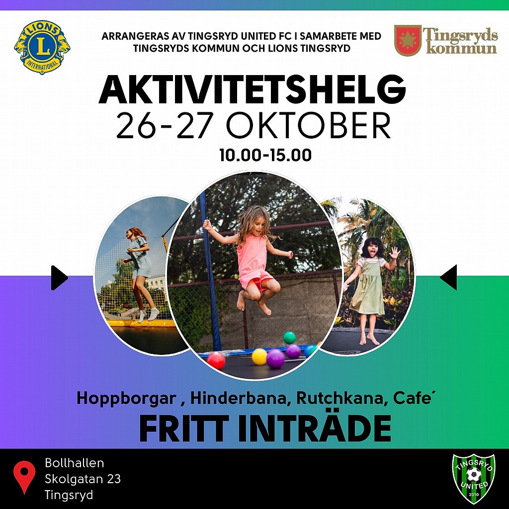 Missa inte att vi även iår kommer arrangera Aktivitetshelgen i Bollhallen. Vi fyller hela hallen med hoppborgar och annat roligt. Då vi får stöd från Lions Tingsryd och Tingsryds Kommun kommer inträdet som vanligt vara Gratis!! Välkomna!